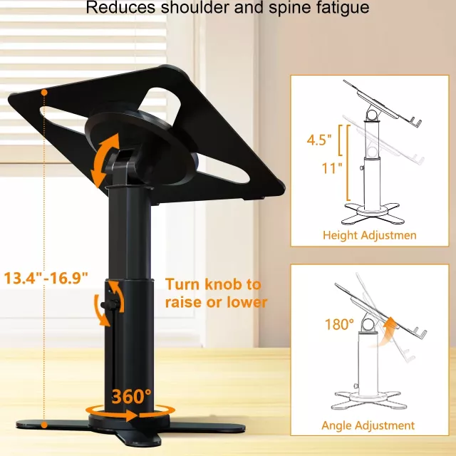 Crafted from durable aluminum alloy and carbon steel, this stand is both lightweight and exceptionally strong. The modern metallic finish adds a professional touch to your desk while ensuring stability. Its height-adjustable design lets you customize your viewing angle, reducing neck and back fatigue during long hours of use. Compact and portable, it easily fits into your bag so you can take comfort with you anywhere.