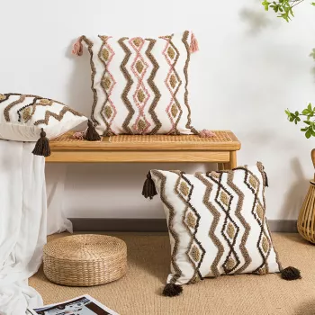 Moroccan Geometric Diamond Tassel Cushion Cover – Pink and Coffee Colors