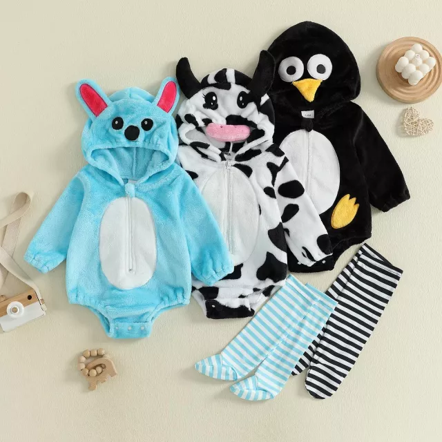 Make your little one the star of Halloween and fall festivities with this cute infant romper and stockings set. Designed for comfort and charm, this cozy hooded bodysuit is available in fun styles like a playful cow, sweet penguin, or silly monster. The easy zip-up closure makes dressing simple, while the soft polyester fabric keeps your baby snug and comfy. Perfect for photos, trick-or-treating, or just cozy fall days, this set is both practical and irresistibly adorable.