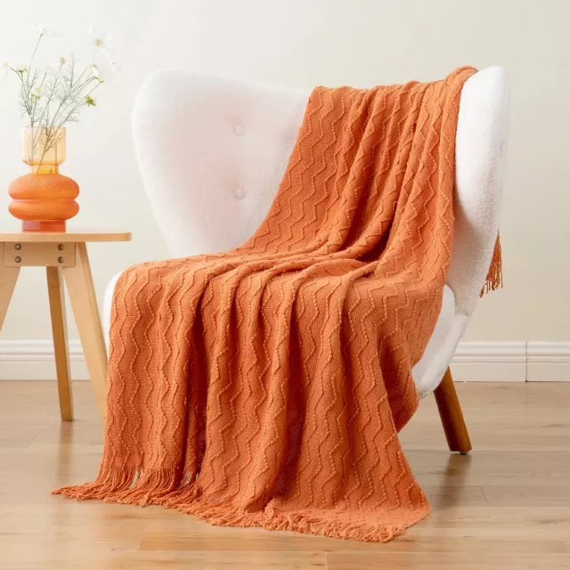 Orange Knitted Throw Blanket with Tassels – Lightweight Cozy Fall Decor