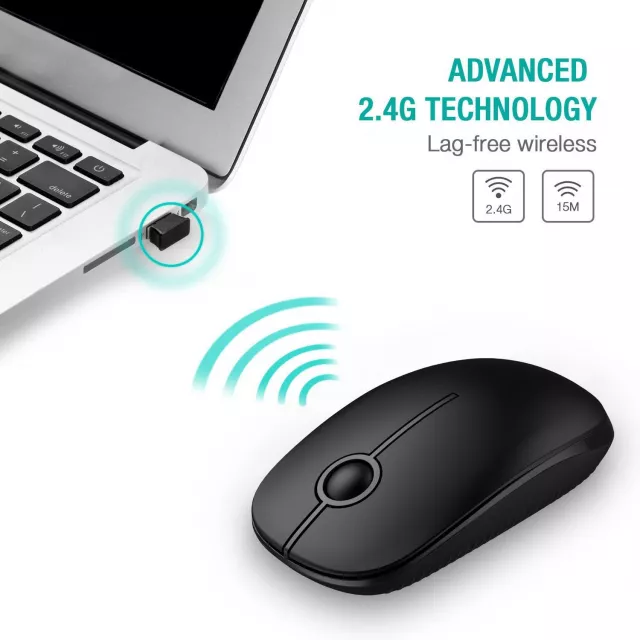 Setup is quick and effortless. Simply plug the included USB receiver into your laptop or desktop, and the 2.4G advanced wireless connection does the rest. With a stable range of up to 50ft (15m), you can work without being tied down by cables. Plus, the mouse’s energy-saving design automatically goes into sleep mode after 8 minutes of inactivity, helping extend battery life. An on/off switch gives you full control when not in use.