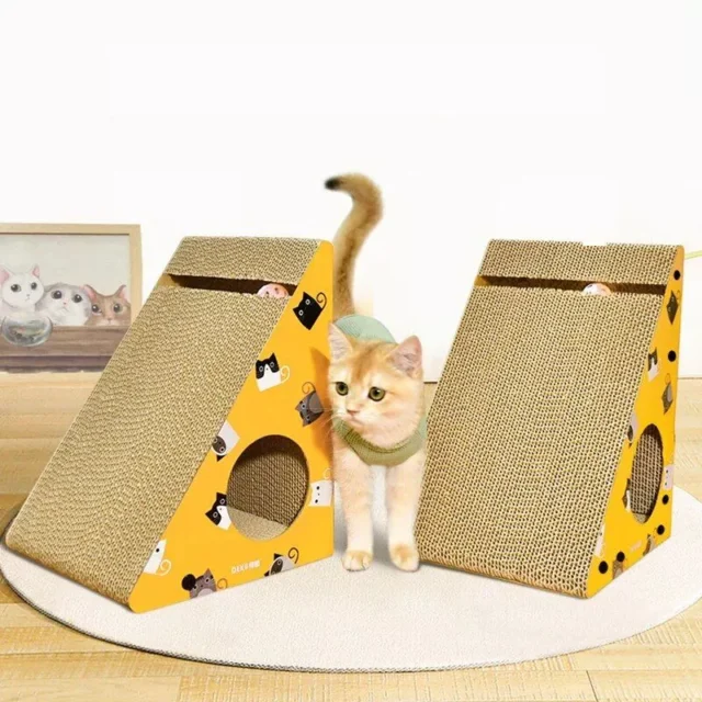 Crafted from high-quality, abrasion-resistant corrugated paper, this scratcher promises durability and long-term use. Its unique triangular shape allows for easy wall attachment, saving valuable floor space in your home. The scratcher is enhanced with holes and a bell, catering to your cat’s natural instincts for scratching, climbing, playing, and resting. In striking blue and yellow colors, it’s not just a toy, but a stylish addition to any room.